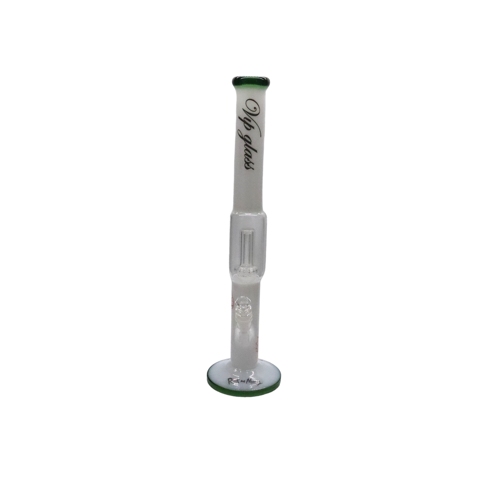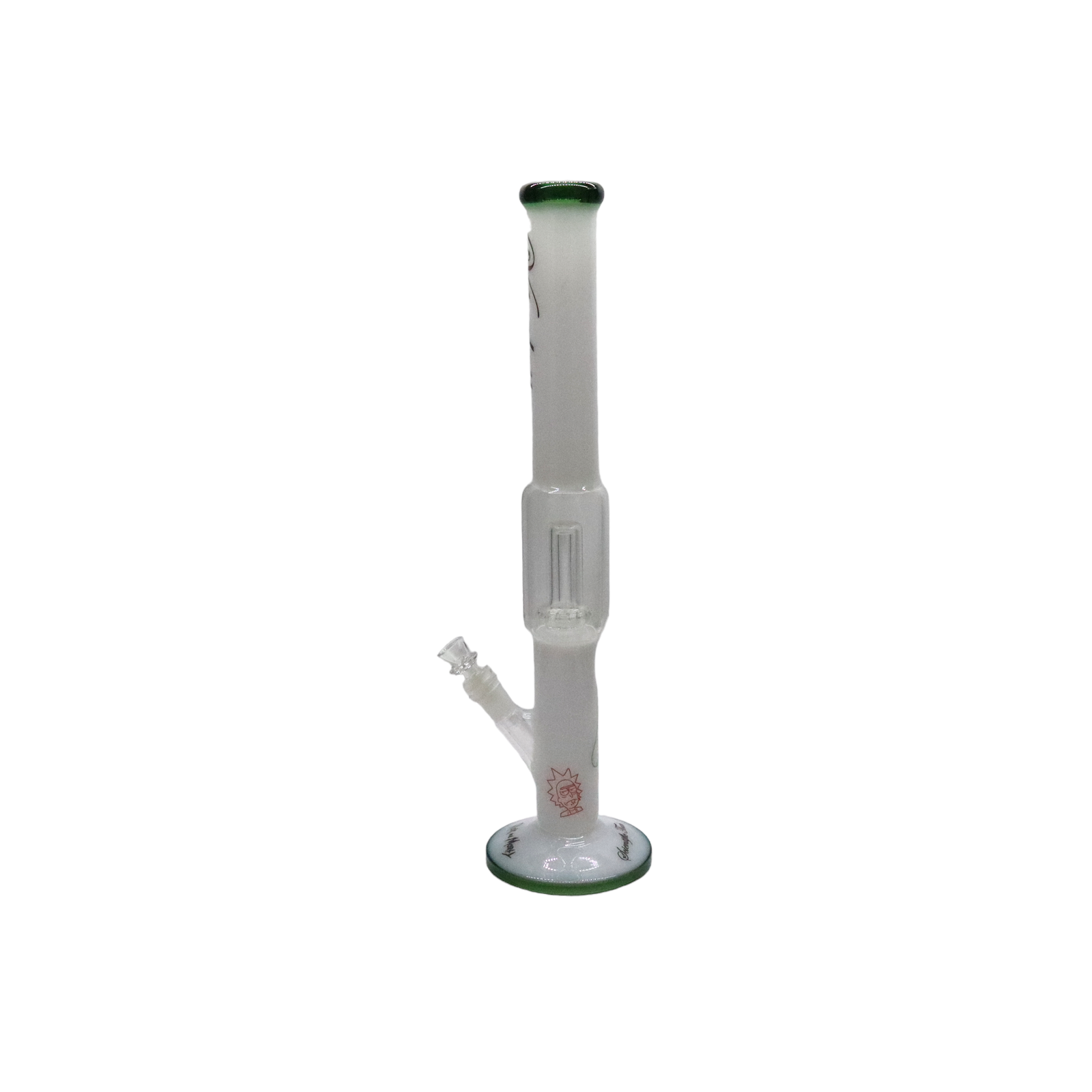 Bong extra largo de vidrio soplado con percolador, color blanco con base y boca verde. Diseño Rick & Morty.