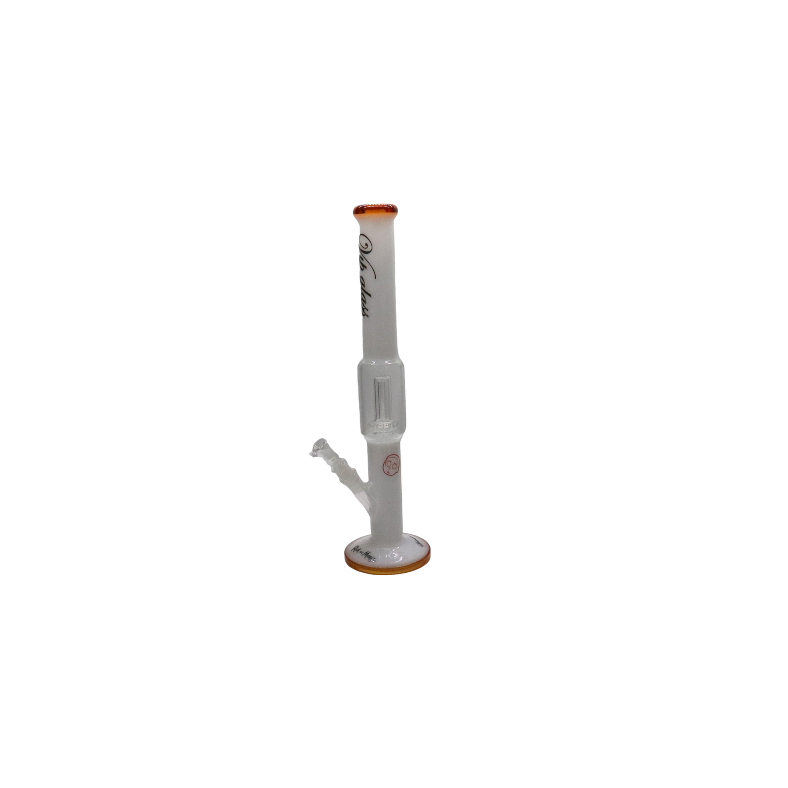 Bong extra largo de vidrio soplado color blanco con base y boca naranja. Diseño Rick & Morty.
