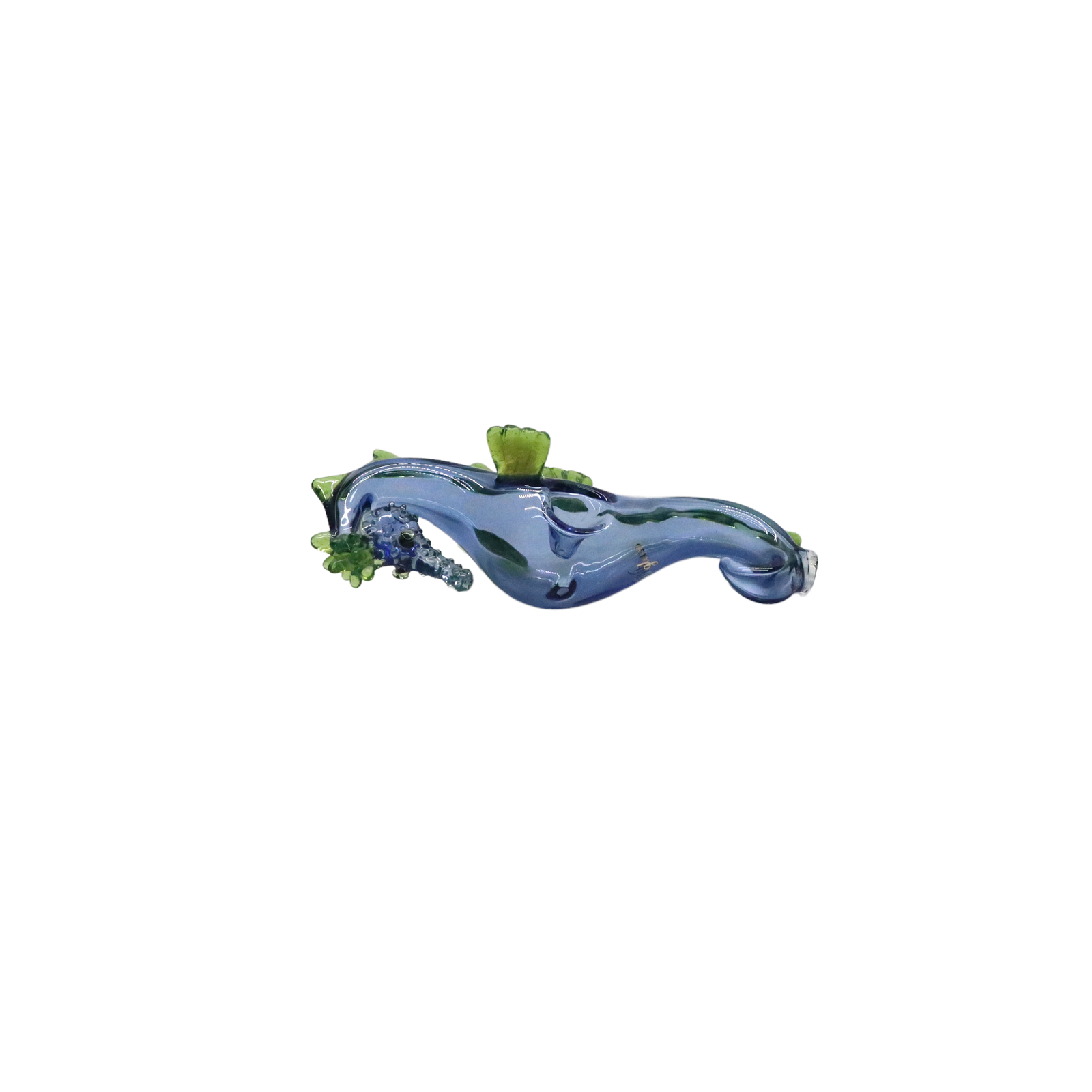 Pieza de colección de vidrio soplado en forma de caballito de mar color azul.